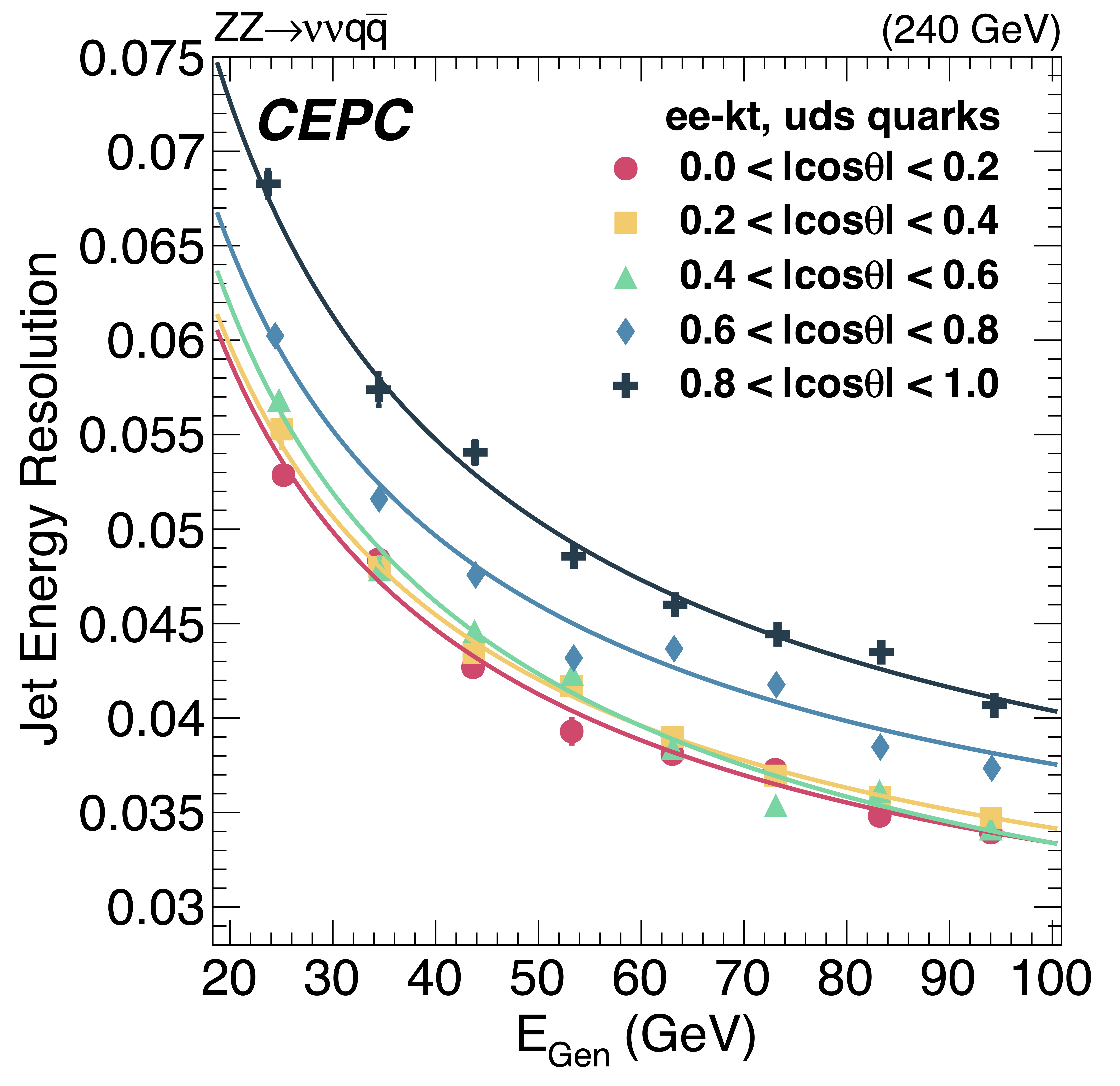 I conducted jet performance at CEPC. Jet reconstruction plays a pivotal role in precision measurements at CEPC, especially regarding properties of the Higgs boson and electroweak observables. My analysis focused on the energy and angular responses of representative 2- and 4-jet processes using fully simulated samples under the CEPC’s baseline detector geometry. In the detector’s barrel region with energies exceeding 60 GeV, I achieved a relative resolution of 3.5% and 1% for jet energy and angular measurements, respectively. Additionally, I controlled the jet energy/angular scale within 0.5/0.01%. I also extracted the differential dependencies of jet responses on both jet direction and energy. Moreover, my analysis included studying the impact of different jet clustering algorithms and matching criteria on jet responses, revealing a relative difference of up to 8%. Furthermore, I dedicated efforts to improve the boson mass resolution for W-, Z-, and Higgs-boson in dijet final states. This research was published in the Journal of Instrumentation, JINST 16 P07037.