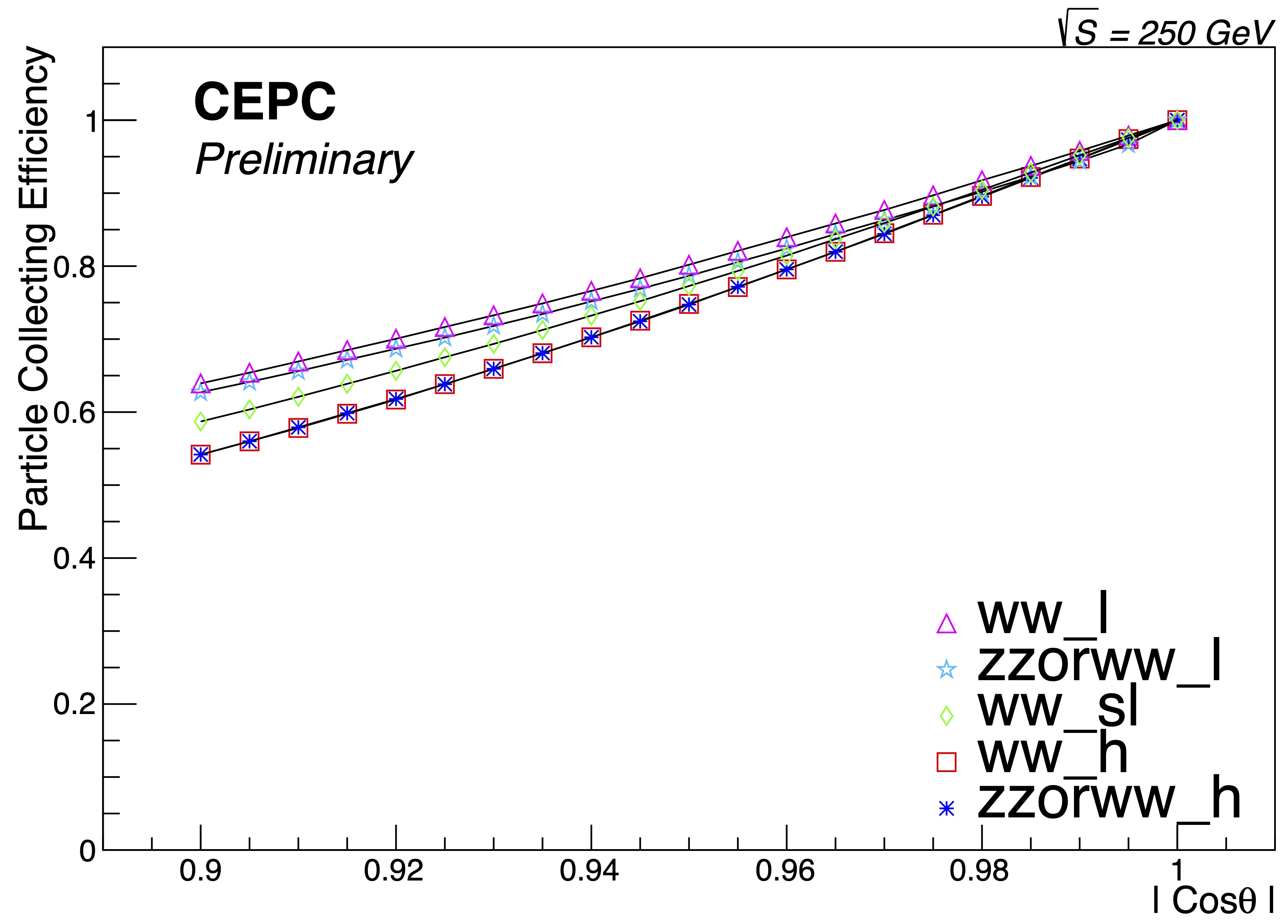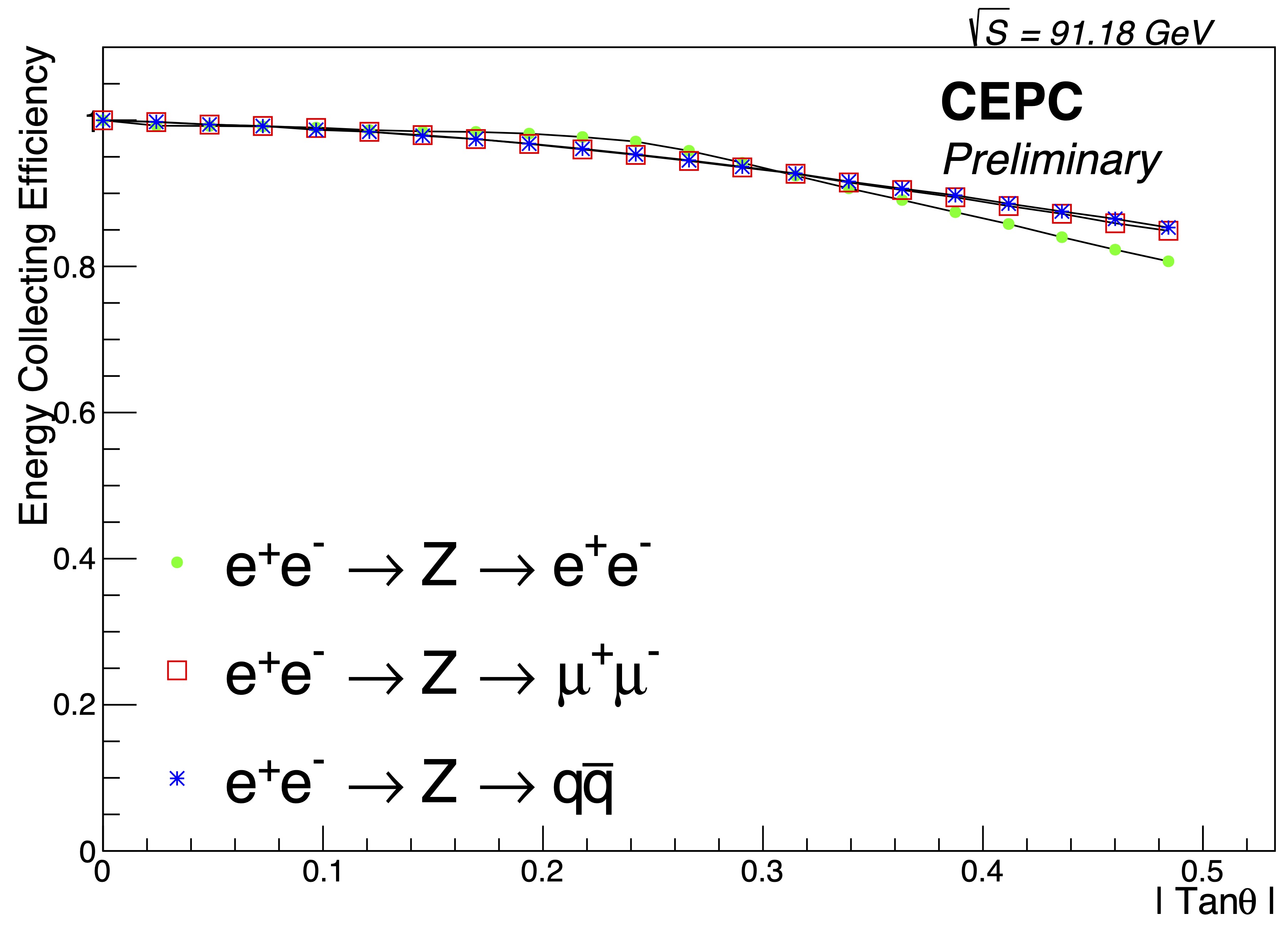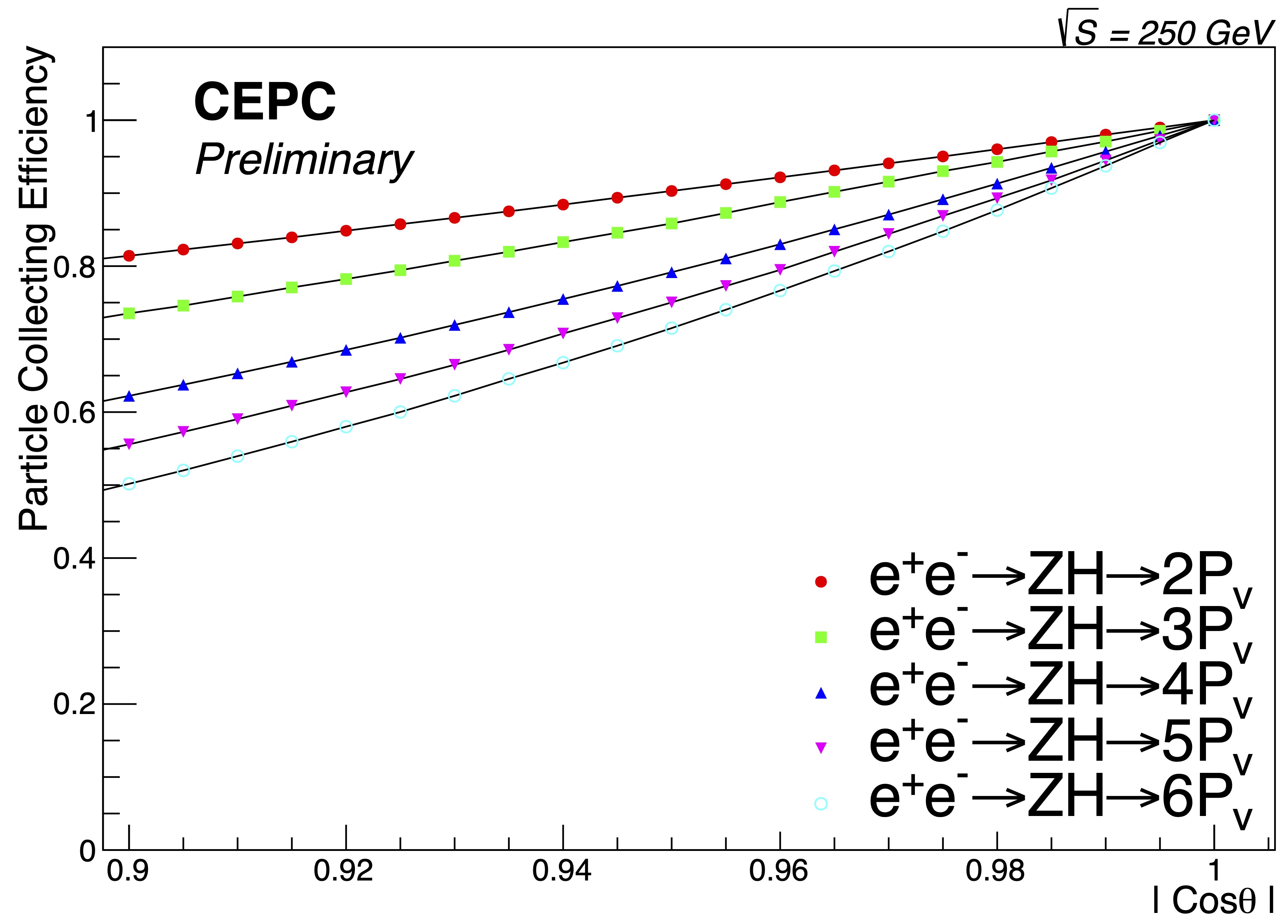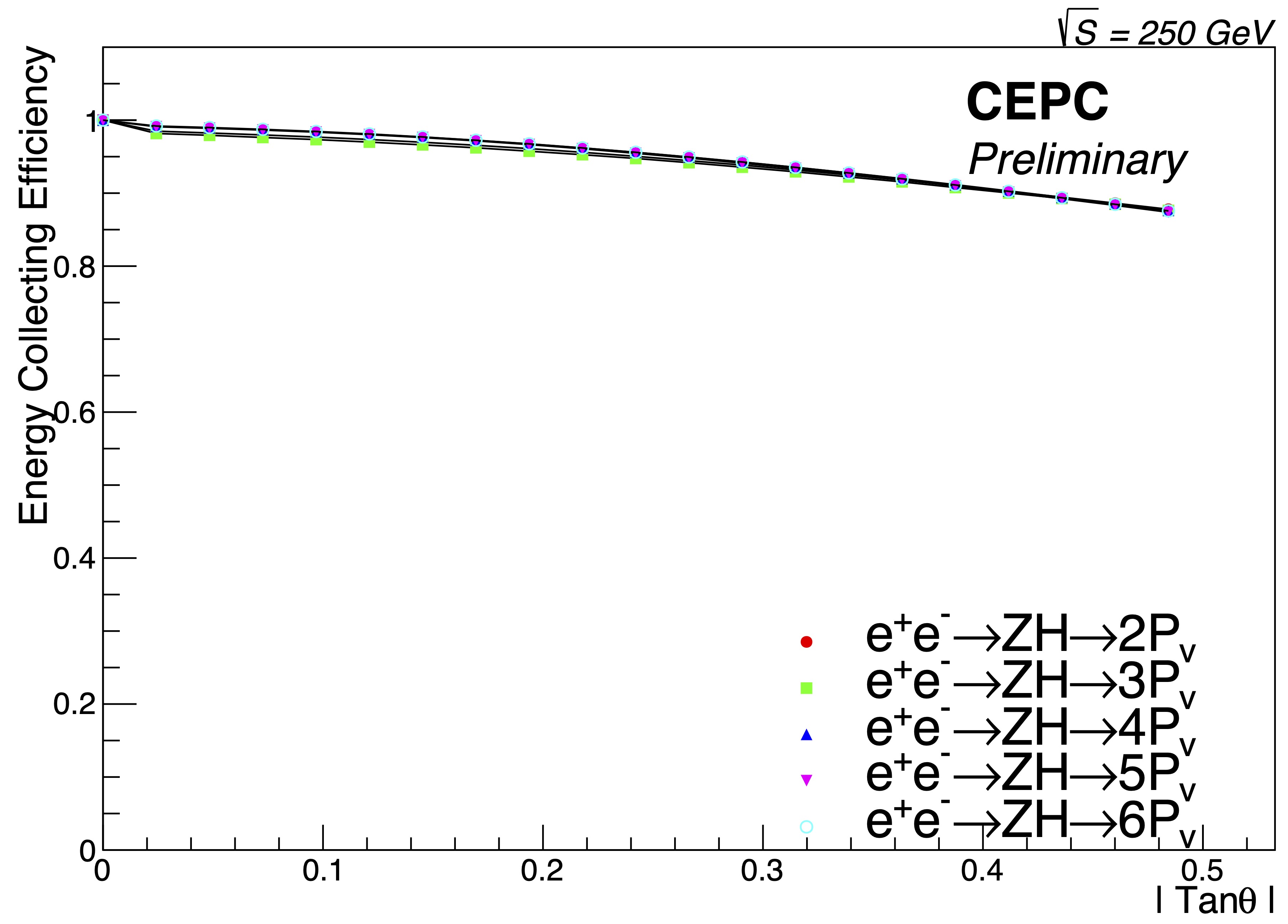Particle collective efficiency refers to the ratio of events where all visible particles fall within the detector’s acceptance to the total number of events. On the other hand, energy collective efficiency represents the ratio of the energy of visible particles within the detector’s acceptance to the total energy of all visible particles.